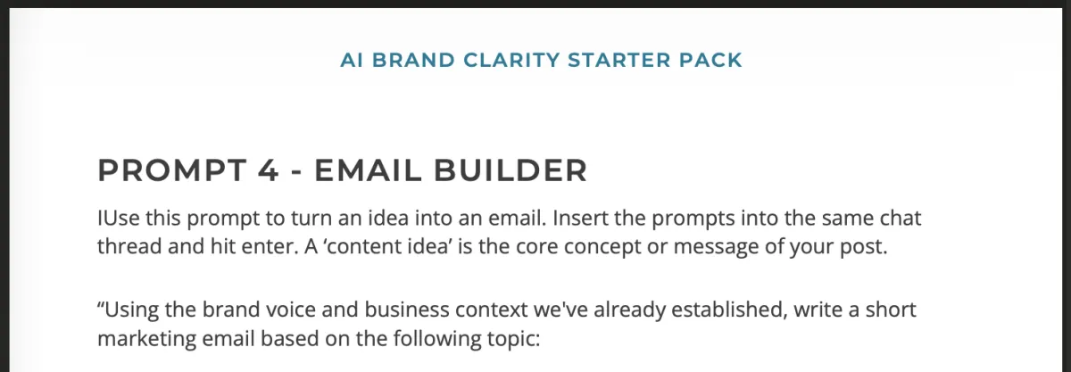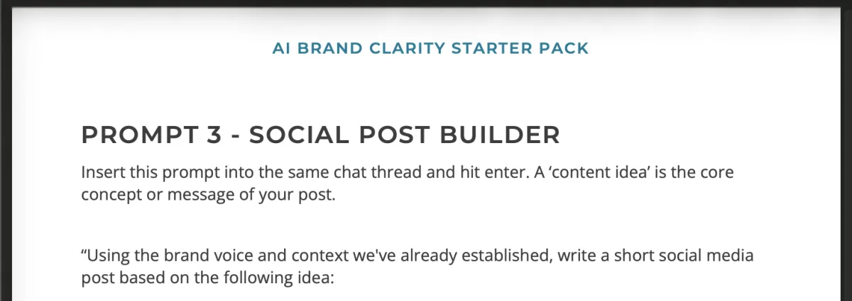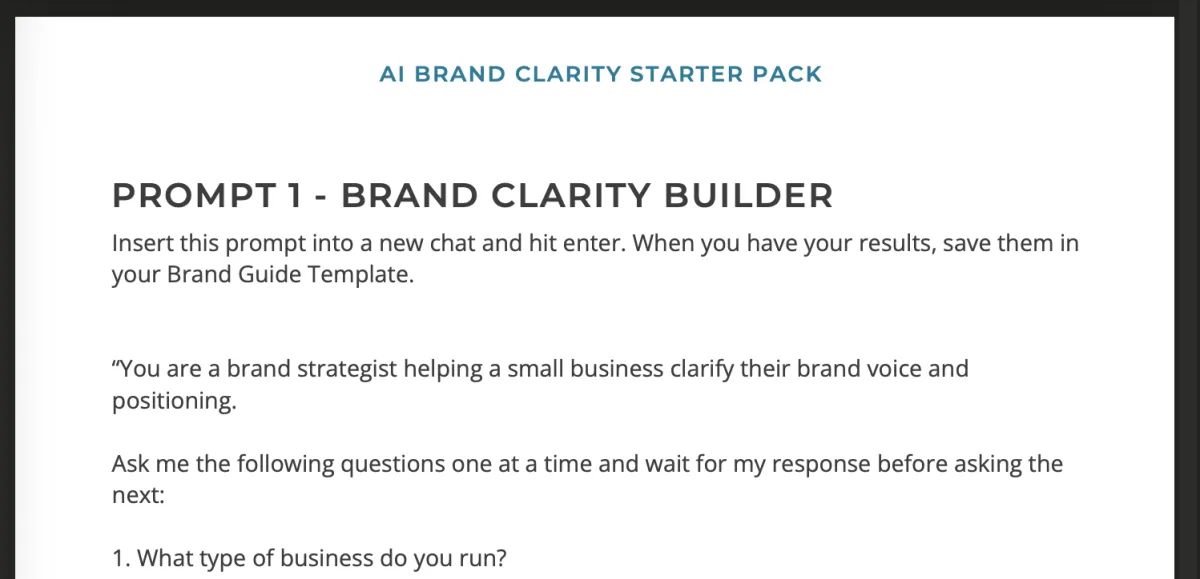 A simple document to capture your brand mission, voice, ideal customer, and positioning as you work through the prompts. In the end, you’ll have a clear brand reference you can use across your website, content, and marketing.