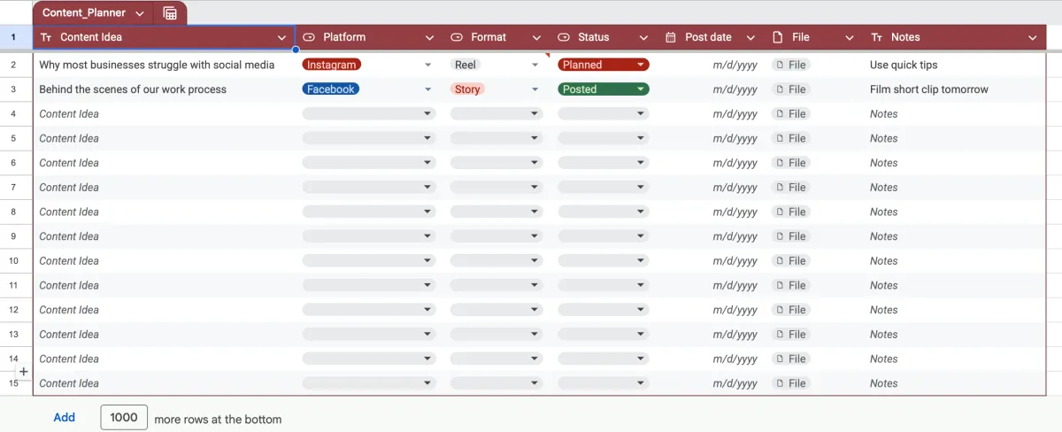 Take the content ideas you generated and turn them into a simple posting schedule. This planner helps you organize your topics, formats, and platforms so your content stays consistent.